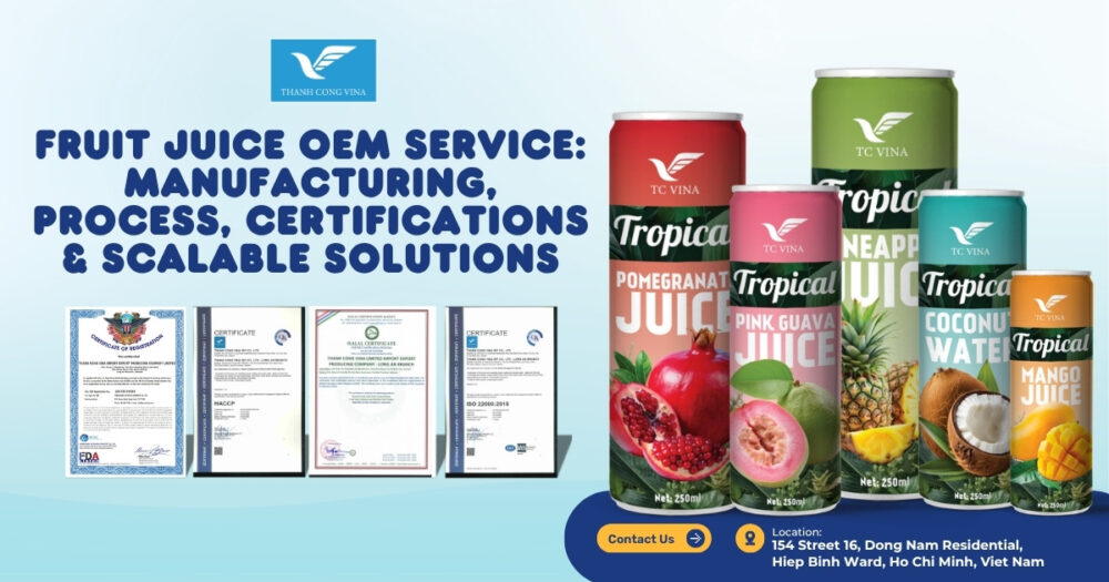 Thanh Cong Vina Beverage is a trusted partner in delivering comprehensive Fruit Juice OEM Service solutions. With advanced production technology, strict quality control, and internationally recognized certifications, Thanh Cong Vina supports beverage companies at every stage of development. As a reliable Fruit Juice OEM Service provider, Thanh Cong Vina helps brands achieve excellence, expand into global markets, and build long-term success in the competitive beverage industry.