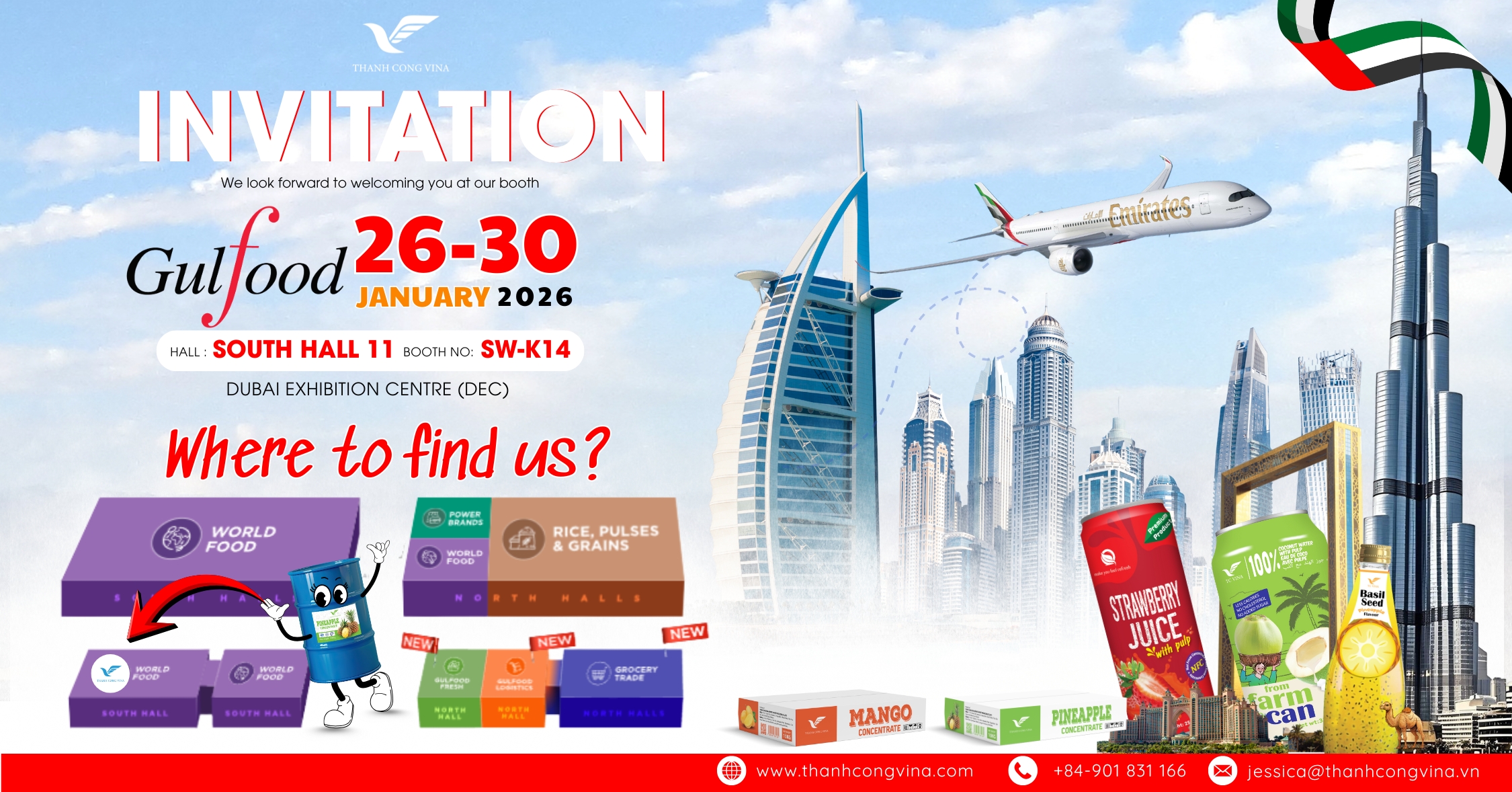Dubai, UAE – January 2026 – Thanh Cong Vina, one of Vietnam’s leading natural beverage manufacturers, proudly announces its participation in Gulfood 2026, one of the world’s largest and most influential annual food and beverage exhibitions. The event will be held from January 26 to 30, 2026, at the Dubai Exhibition Centre (DEC) in Dubai, United Arab Emirates — a global hub connecting food and beverage professionals from around the world.